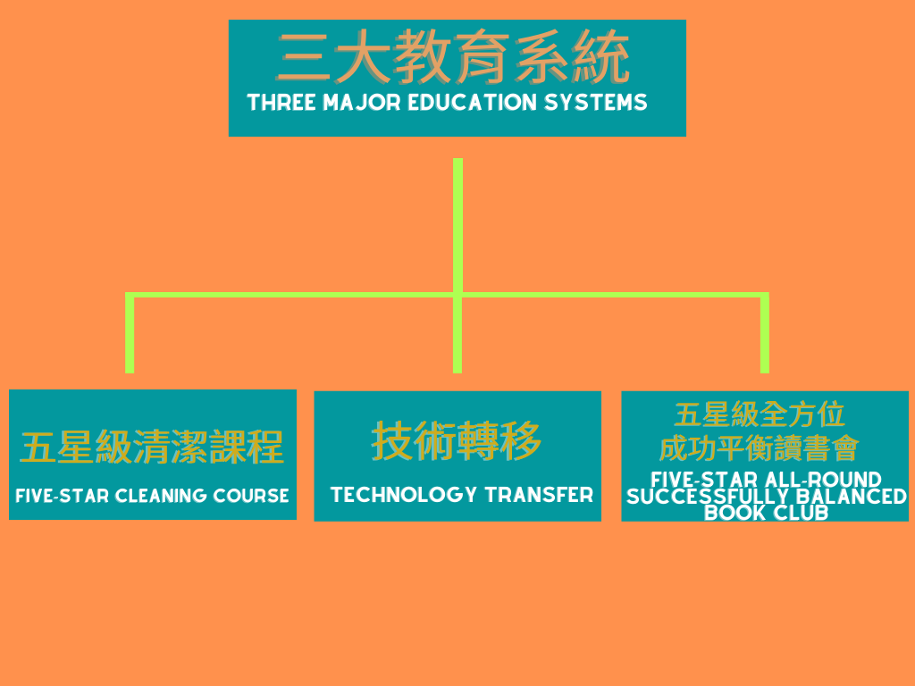 公司的三大教育系統最主要是透過五星級全方位平衡讀書會裡面的所有世界頂級作者所寫的書籍,只要看完這些書籍且融會貫通並善用公司給於的技術轉移方法,就能簡單製作五星級清潔教育課程,不需要花大錢就能做出一套屬於自己的教育系統並輕鬆地呈現作品讓全世界的人看見。
